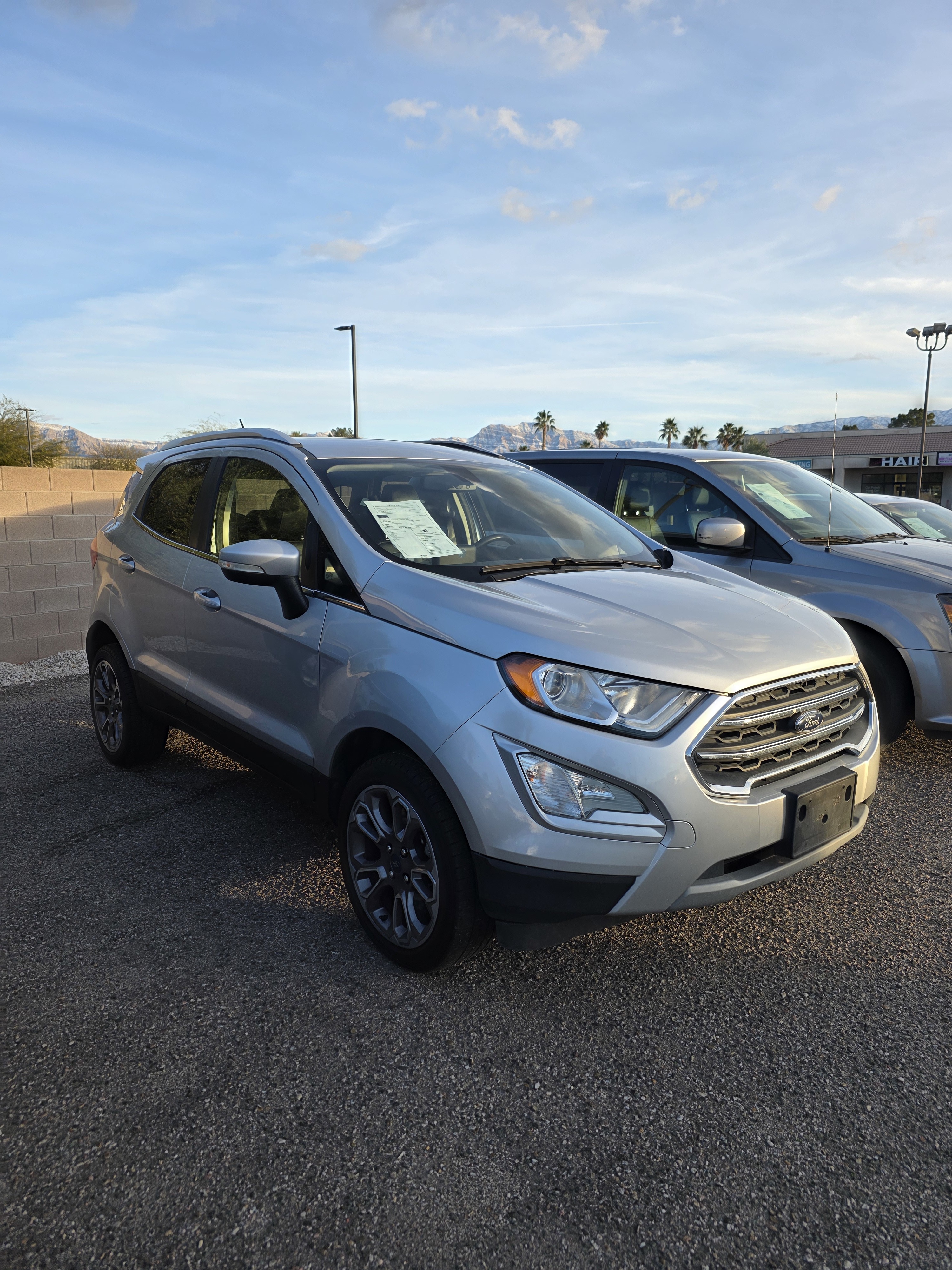 Expand View-more 2019 Ford EcoSport Titanium AWD Child Safety Door Locks, Vehicle Anti-Theft, ABS Brakes, Driver Airbag, see more $13,250 internet price Mileage: 76,537 Engine: 2.0L L4 DOHC 16V Transmission: Automatic Interior color: Exterior color: Fuel type: VIN: MAJ6S3KL4KC268053 Doors: 4 Door Stock number: 268053 Fuel economy: 23/29 Email Us From: Your message: Hello, my name is and I'm writing you today to learn more about the 2019 Ford EcoSport Titanium AWD listed for $13,250.00. I live in the area and I would like to hear back from you soon and learn more about this vehicle. Please call me at at your earliest convenience. Send Email Vehicle Description Standard Features What is my Monthly Payment ? Have a Trade-In? Vehicle Description Standard Features Child Safety Door Locks Vehicle Anti-Theft ABS Brakes Driver Airbag Front Side Airbag Passenger Airbag Side Head Curtain Airbag Cruise Control Telescopic Steering Column Driver Multi-Adjustable Power Seat Front Heated Seat Fog Lights Alloy Wheels Power Windows What is my Monthly Payment ? What is my monthly payment? Price Down Payment Interest Rate (%) Term (months) 12 24 36 48 60 72 / month CALCULATE *Calculation is an estimation and doesn't include taxes and fees. Have a Trade-In ? Looking to trade in a vehicle towards this purchase? Fill out our contact form below with your vehicle information and we'll contact you to to provide an evaluation. From: First Name: Last Name: Phone: Message: Year: Make: Model: Submit 2019 Ford EcoSport Titanium AWD Child Safety Door Locks, Vehicle Anti-Theft, ABS Brakes, Driver Airbag,